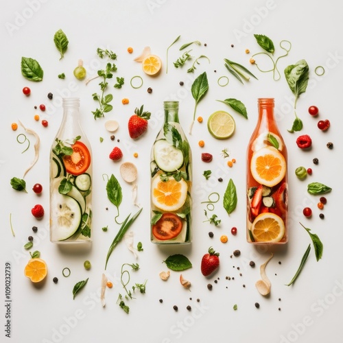 Three bottles filled with colorful fruits and herbs, showcasing refreshing drink ingredients.