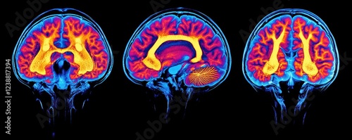 Three brain MRI scans, axial view, dark background, medical research