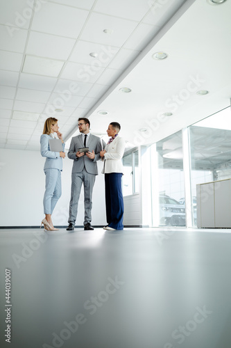 Three business colleagues discussing work related matters on an office building hallway. Team work.