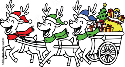 Three cartoon reindeer pulling a Christmas sleigh filled with gifts and a tree Keywords: reindeer