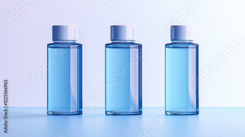 Three Clear Bottles with Blue Liquid on a Minimalist Background