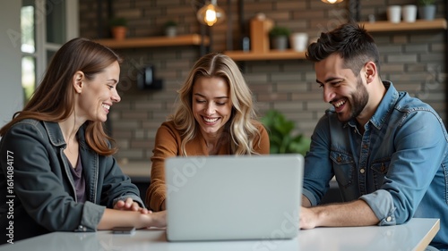 Three colleagues having a productive discussion around a laptop