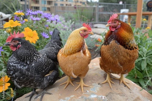 Three colorful chickens stand on a rock amidst vibrant flowers, showcasing their unique plumage in a charming outdoor setting.