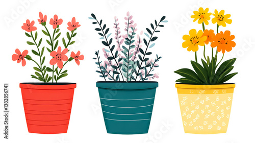 Three colorful flower pots, floral arrangements, vivid colors ,cut out transparent