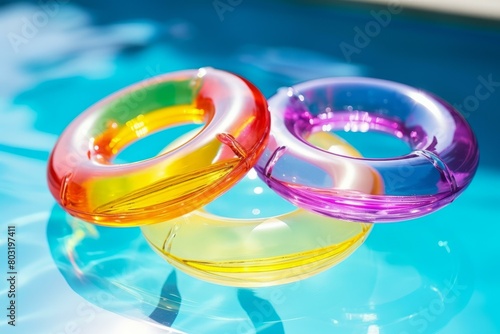 Three Colorful Plastic Rings Floating in Blue Swimming Pool Water