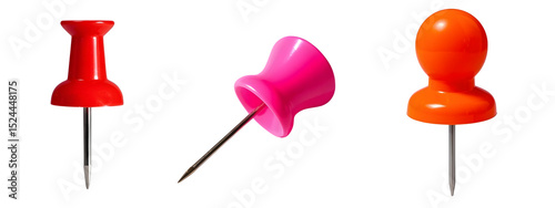 Three colorful push pins isolated on transparent background