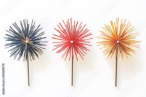 Three colorful spiky sphere decorations on sticks against a plain white background in a studio shot