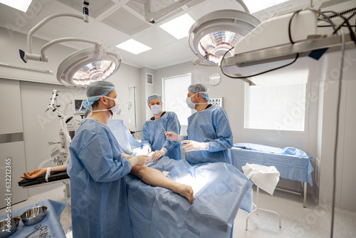 Three confident surgeons performing surgical operation on a patient's knee in operating room. Concept of real surgery and invasive treatments