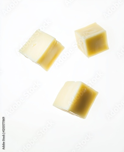 Three cubes of cheese floating on a white background, high resolution photography for food and still life compositions