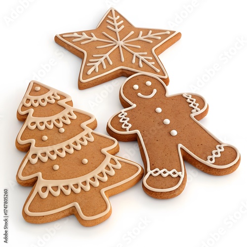 Three decorated gingerbread cookies in festive christmas shapes on a white background