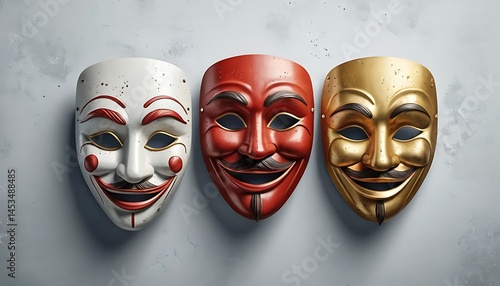 Three Decorative Masks in White, Red, and Gold Arranged Together