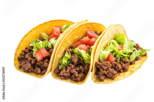 Three delicious beef tacos with lettuce and tomato in crispy shells, cut out
