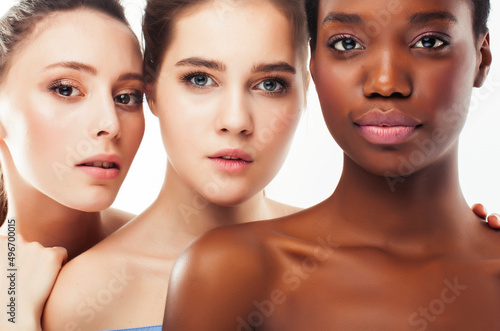 three different nation woman: african-american, caucasian together isolated on white background happy smiling, diverse type on skin, lifestyle real people concept