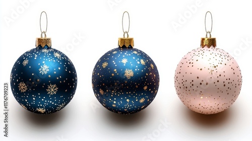 Three elegant Christmas baubles in blue, dark blue and pink with gold snowflake patterns on white background.