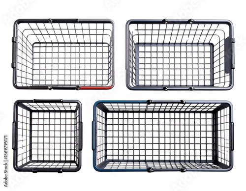 Three Empty Wire Shopping Baskets in a Row, Overhead Flat Lay, Isolated on Transparent Background