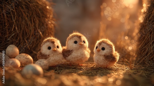 Three fluffy chicks nestled among hay with several eggs, a tranquil scene evoking feelings of warmth and new life