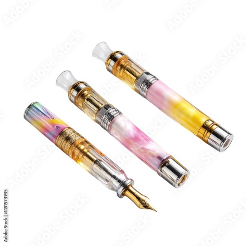 Three fountain pens with colorful barrels isolated on white background
