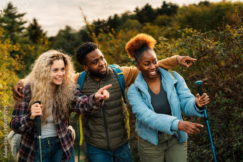 Three friends hiking in a forest, smiling and pointing at same direction. They are wearing casual outdoor clothing and holding trekking poles.