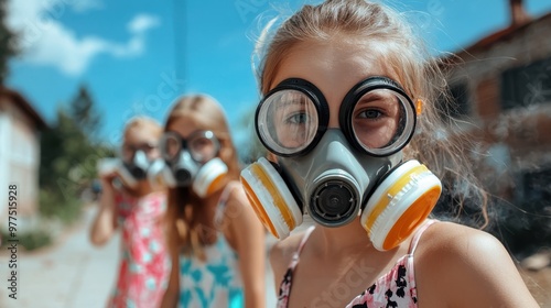 Three girls, dressed in bright summer outfits and goggles, are seen having fun outdoors on a sunny day, exemplifying childhood joy and playful adventures in a suburban setting.