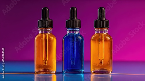 Three glass dropper bottles with colored liquid on vibrant colorful background.