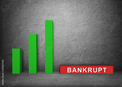 Three green columns standing in ascending order and one red collumn with a label 'bankrupt' falling down