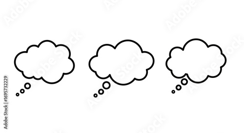 Three hand drawn white speech bubbles or thought clouds isolated on a black background