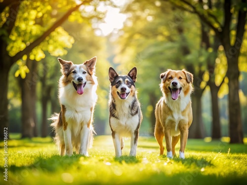 Three Happy Dogs Playing in Sunny Park - Stock Photo