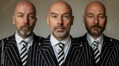Three identical men in striped suits stand side by side, creating a surreal effect with their identical appearance and serious expressions.