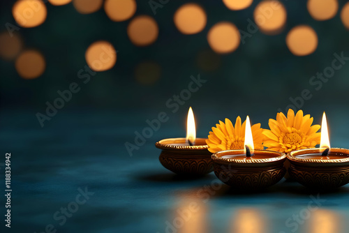 Three illuminated oil lamps with flowers create a serene ambiance with warm background lights