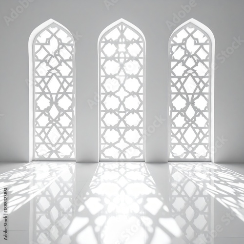 Three Islamic Geometric Patterned Arch Windows Casting Shadows on a White Floor in a Bright Room