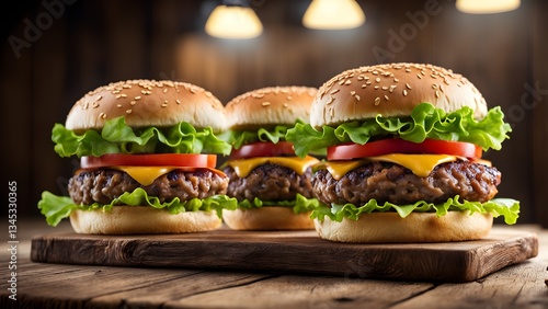 Three juicy cheeseburgers lettuce, tomato, melted cheese, served a rustic wooden board.