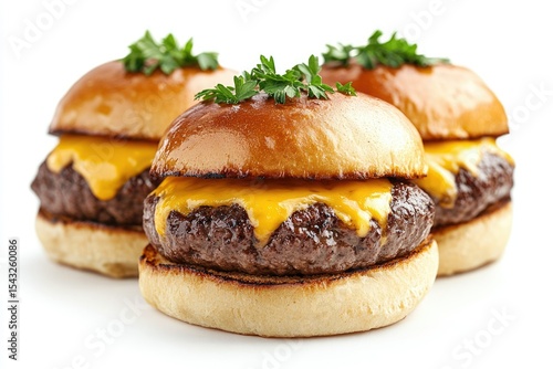 Three juicy cheeseburgers with melted cheddar, toasted buns, and fresh parsley.