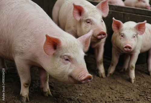 Three little pigs are standing in the dirt and gazing at the camera
