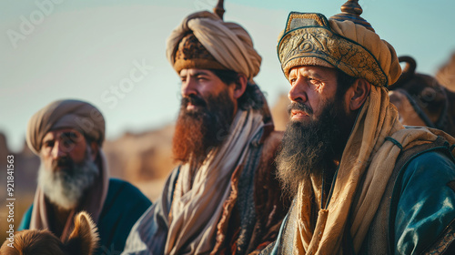 Three men in traditional attire on a desert journey.