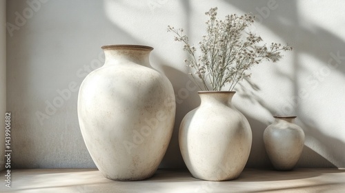 Three minimalist ceramic vases of different sizes with a dried flower arrangement, simple modern home decor, natural light, neutral color palette, shadow play