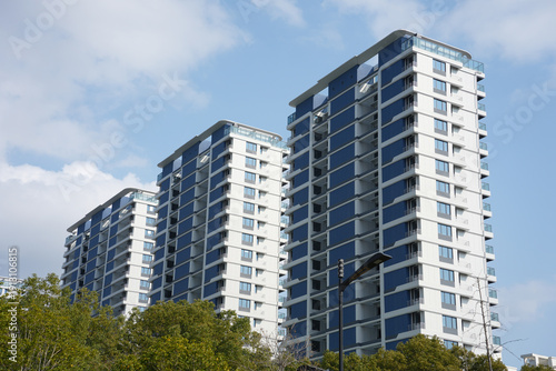 Three modern high-rise residential buildings with blue and white facades captured from a low-angle perspective