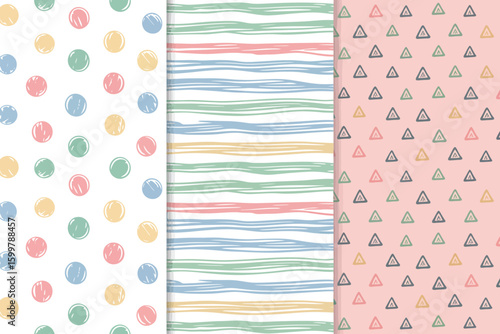 Three pastel patterns featuring polka dots, horizontal lines, and triangles in a repeating design