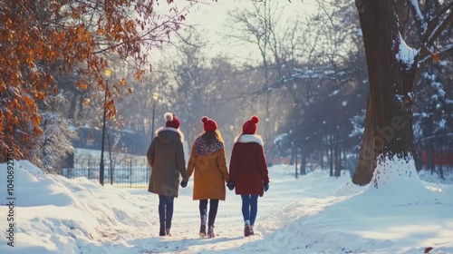 Three people walking through a snowy park adorned with glowing Christmas trees in a magical evening setting.