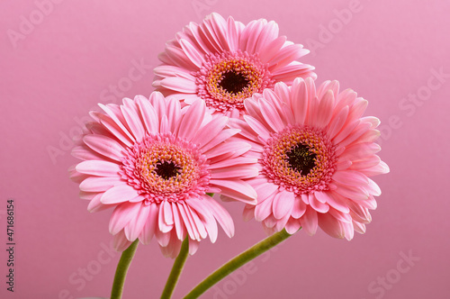 three pink gerberas on a pink background