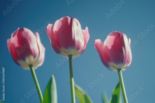 Three pink tulips blooming in a bright blue sky, perfect for a spring or summer themed image