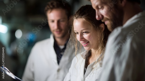Three professionals in lab coats collaborate on a document in a dimly lit research setting with one woman smiling