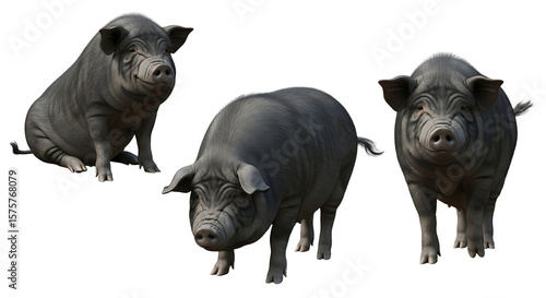 Three Realistic Dark Gray Pigs in Different Poses.