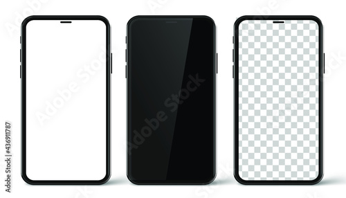 Three realistic smartphone mockup set. Mobile phone blank, white, transparent screen design on white background. Vector illustration