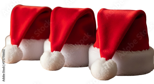 "Three Red Velvet Santa Hats with White Fur Trim and Pom-Poms Isolated on White — Festive Christmas Headwear Set"