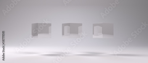 Three reflective metallic cubes floating in a light gray room. Infinite background, wallpaper, banner. Place for text, mockup, copy space. 3d illustration. Minimal concept.