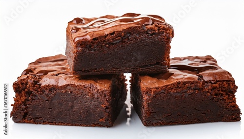 three rich chocolate brownies with moist gooey texture on transparent background