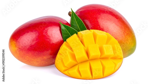 Three ripe mangoes, one cut open to reveal diced fruit, on white