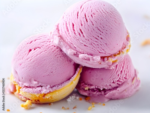 Three scoops of delicious pink strawberry ice cream sit on a white plate with crumbled cookies.