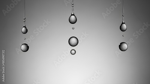 Three sets of clear water drops suspended against a smooth grey gradient background, showing various sizes and reflections.