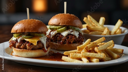 Three sliders—cheese and bacon, pulled pork, and crab cake—served with fries.